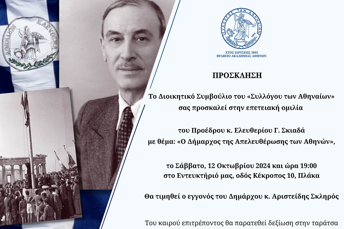 Το Σάββατο 12 Οκτωβρίου 2024 και ώρα 19:00 θα πραγματοποιηθεί στο Εντευκτήριο του «Συλλόγου των Αθηναίων» (Κέκροπος 10,Πλάκα) η επετειακή εκδήλωση-ομιλία για τα 80 χρόνια από την Απελευθέρωση των Αθηνών με ομιλητή τον Πρόεδρο κ. Ελευθέριο Γ. Σκιαδά και θέμα: «Ο Δήμαρχος της Απελευθέρωσης των Αθηνών».