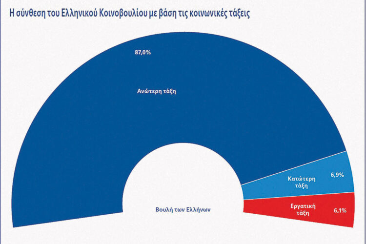 Ἡ πλειονότης τῶν βουλευτῶν τῆς ἐργατικῆς τάξεως ἀνήκει σέ πολιτικά κόμματα τά ὁποῖα εὑρίσκονται στά φάσματα τῶν πολιτικῶν ἄκρων, εἴτε ἀριστερά (ΚΚΕ) εἴτε ἀκροδεξιά (Ἑλληνική Λύσις). Ἐν κατακλεῖδι, 255 ἀπό τούς 300 βουλευτές (87%) προέρχονται ἀπό τήν ἀνωτέρα τάξη, ἀλλά δέν ἀνήκουν ἀποκλειστικῶς σέ Κοινοβουλευτικές Ὁμάδες κομμάτων μέ κεντροαριστερό (ΠΑΣΟΚ-ΚΙΝΑΛ) ἤ καί κεντροδεξιό (ΝΔ) ἰδεολογικό πρόσημο. Ἑστιάζοντας στήν διερεύνηση τῆς ἐπαγγελματικῆς συνθέσεως τῆς ἀνωτέρας τάξεως, καταδεικνύεται ὅτι ἡ πλειονότης τῶν βουλευτῶν εἶναι δικηγόροι (66), ἰατροί (31), τεχνικοί ἐμπειρογνώμονες (29), καθηγητές πανεπιστημίου (29), κομματικά καί πολιτικά στελέχη (20) καθώς καί δημοσιογράφοι (19).